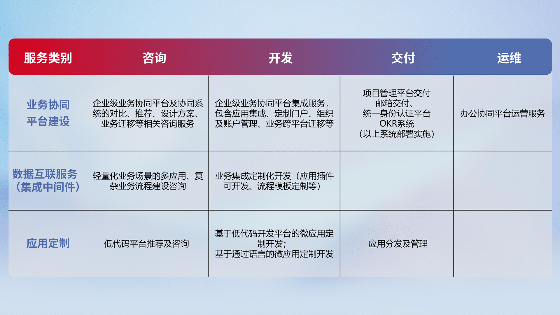 针对钉钉、、、、企微、、、、IDaas等平台级产品提供产品的规划、、方案、、、、交付、、定制化开发等服务,,,,实现如统一协同办公、、、、智能客户服务、、混合会议管理、、、智能数据查询、、等业务场景,,,实现数字化转型。。