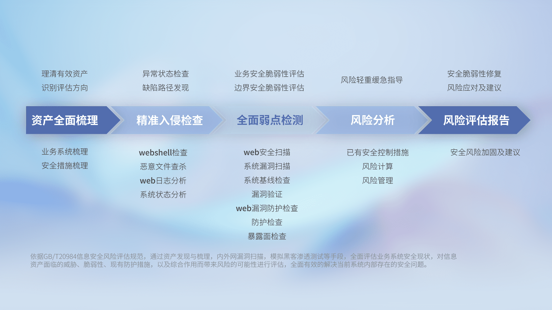 针对客户行业特性,,,以专业的安全服务+多厂商联合解决方案提供专属的一站式安全管理服务,,,帮助客户全面感知网络空间威胁,,,,基于识别、、检测、、、、分析、、、、防护、、、监测、、、、响应的服务理论模型,,,从方案咨询、、、集成交付、、、、评估验证、、、优化加固、、运维运营,,致力于为客户提供完整的闭环管理式安全服务。。。以实战经验为客户打造高抵御风险的安全体系,,帮助客户发现威胁、、、、对抗威胁、、处置威胁,,,不断积累安全对抗能力,,持续保障数字化安全。。。。